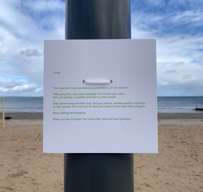 is a set of six performance pieces for anyone, anywhere, to perform. The six pieces draw upon minor gestures observed during the current period of immobility and social distance. Each starts from a score (a document which communicates the intention of the piece, but which is open to interpretation by the performer). It is up to the performer how, where and when they perform each piece and whether they make any sort of record of their performance.