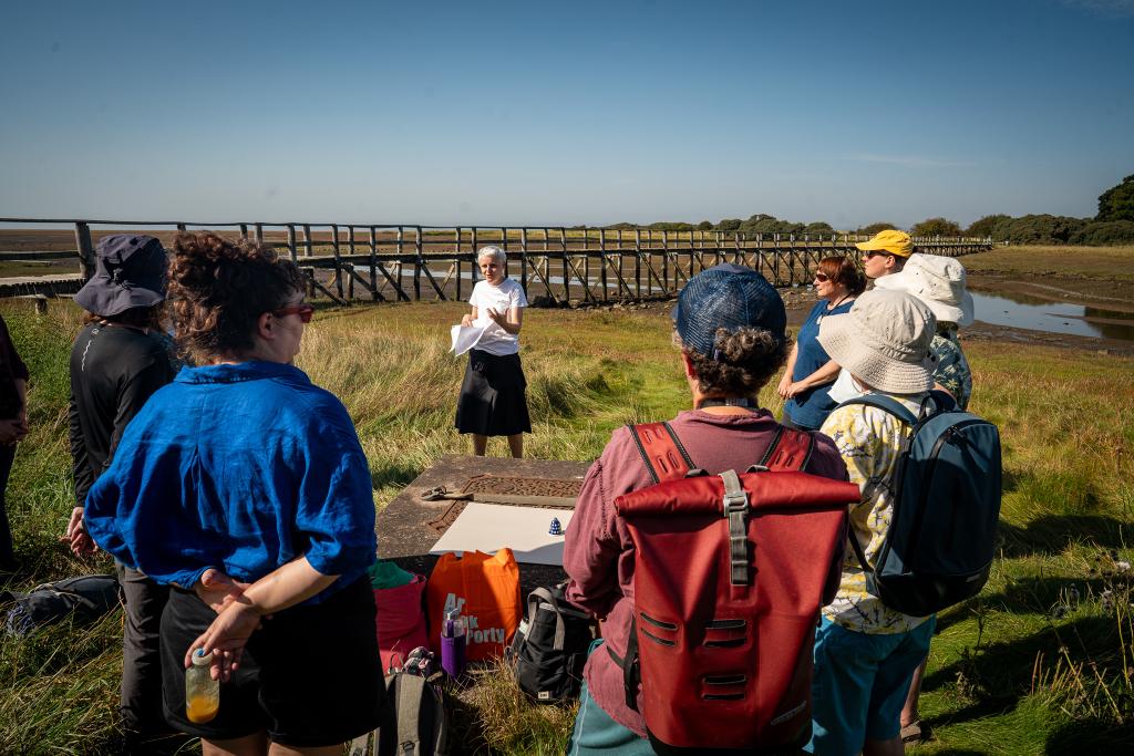 Artist Dana Olarescu leading walking workshop at Aberlady Saltmarsh (2023), with contributions from Helena Simmons (Green Shores)