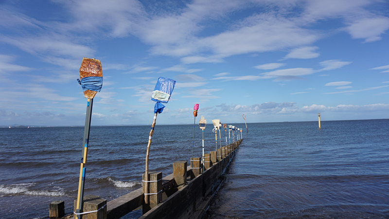 As part of the ART WALK’S ‘All At Sea’ programme, Jenny created a series of masked forms relating to the precautions workers took to protect themselves from the heat as they unloaded the ceramics, installed along one of Portobello’s beach groynes.